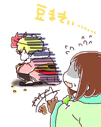 \嬉々として豆投げつけられるとダメージが凄そう。の図/